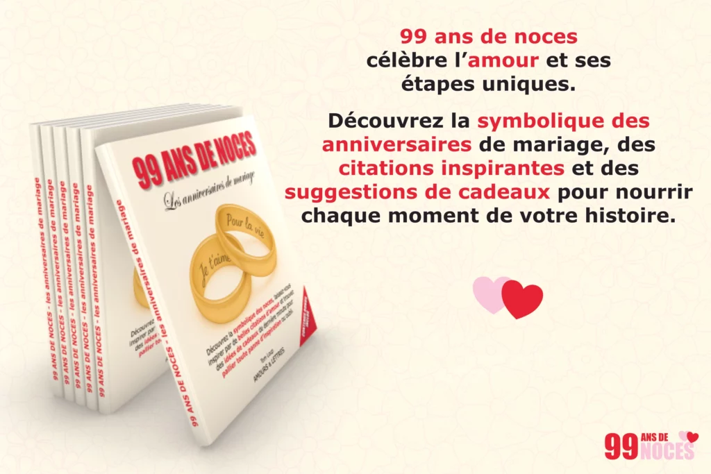 Plongez dans la signification des 99 noces, laissez-vous porter par de touchantes citations d’amour et dénichez des idées de cadeaux pour éviter la panne d’inspiration… ou briller même à la dernière minute.