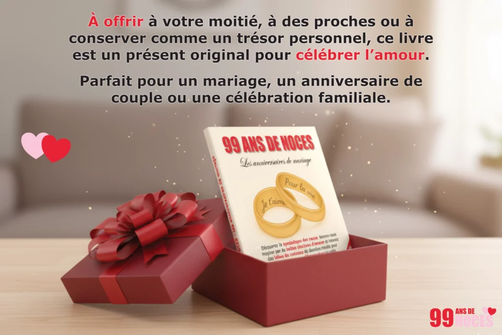 À l’image d’un fil d’or traversant le temps, chaque anniversaire de mariage s’accompagne d’un nom et d’une matière qui en enrichissent la symbolique. Ce site réunit les 99 noces, présentées une à une sur une page dédiée, avec leur illustration, leur signification et parfois des idées de cadeaux pour marquer l’événement.